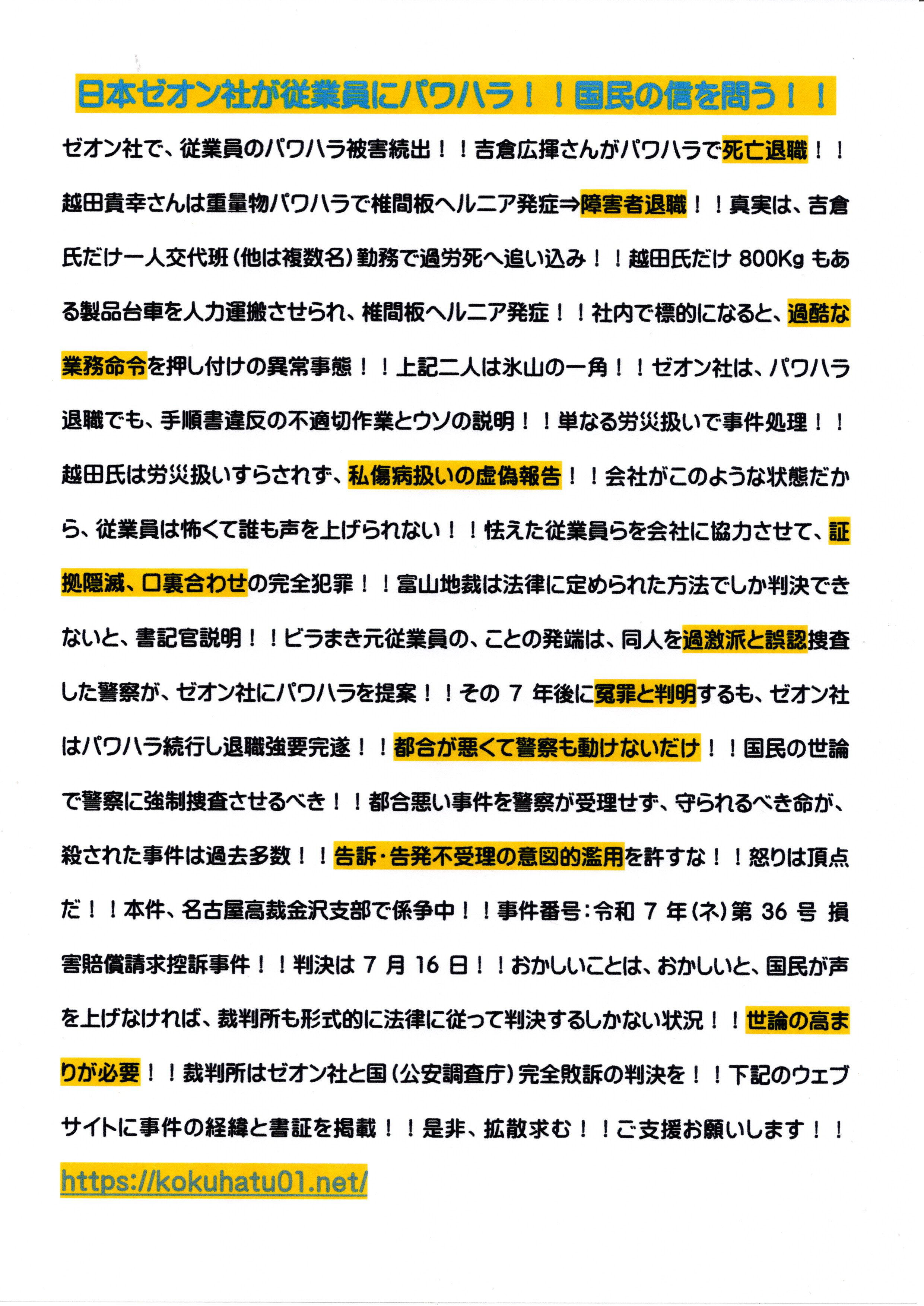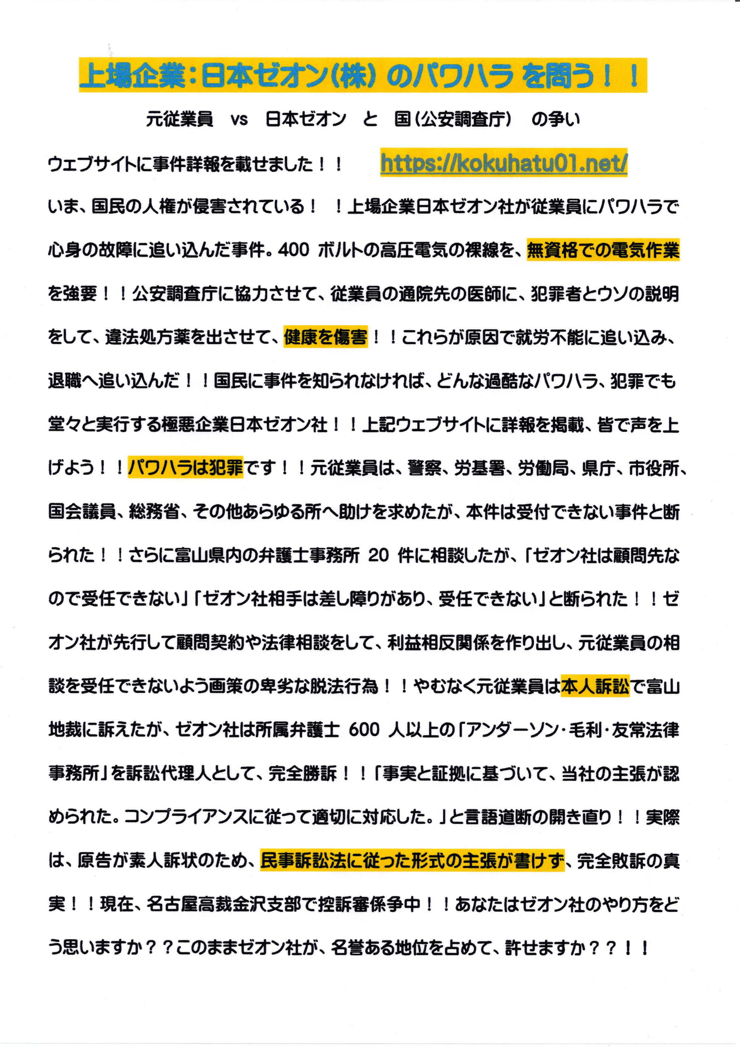 Xは日本ゼオン(株)の正社員であった。またXは、会社とは別件で、2003年に公安調査庁から依頼されて、中核派(過激派団体のひとつ)の情報提供者とされた。情報提供者とは、国の指示で特定組織に入り、内部情報を国に報告するボランティアである。Xの場合、特定組織が中核派だったという訳だ。分かり易く言えば、送り込みのスパイである。国家安全保障の為に必要な役割との説明だった。公安調査庁からは「君の身に何かトラブルがあったら、こちらは国家組織を挙げて、君のトラブルを解決する用意があるから、何でも相談してくれ」と説明されていた。しかし、実際には公安警察が、Xを本当の中核派と誤認して、2009年にゼオン社へ訪れた。公安警察は、同社に、Xを退職に追い込むように依頼した。いわゆる誤認捜査による「冤罪」である。退職のさせ方はパワハラである。具体的には、困難な仕事の無茶ぶりと押し付け、不必要な叱責、著しく低い評価を付けて低賃金にする、社内で孤立させる等である。それを組織的に、統一感を持ってやるのだ。端的に言えば、いじめだ。ひとつ挙げると、Xは無資格で電力測定を強要させられた。工場内の工業用電流440Vの活線である裸線(配電盤内のブレーカー部付近)の電力測定を100カ所くらい強要された。感電死を伴う危険作業であるが、名目は業務命令として強制された。さらには、Xの通院先であったクリニックにも公安警察が来て、医師をそそのかせて、処方薬をいじられた。医師は、Xが過激派、中核派だと説明されたので、警察に協力した認識だった。何も知らないXは、医師のウソの説明を信じて、出された処方薬を服用し、徐々に病状を悪化させた。2015年4月、Xは社内で本当の中核派と勘違いされているのではないか?と疑問を感じた。そこでゼオン社に、公安調査庁の依頼で中核派に接していることを話した。同時に、公安調査庁にも経緯を報告した。次の日、公安調査庁から「これは国家機密だから二度と会社に話してはいけない。君は国家の協力者だから、絶対に不利益にはしない。」と約束を取り付けられた。Xは、以後この守秘義務を守った。あとで分かったが、公安調査庁はこの後、すぐにゼオン社を訪れ、「あれは本当の中核派の言い訳だから、騙されないで今まで通りパワハラを続けて、退職させて下さい」と説明していた。騙されたゼオン社は、当然怒り、さらにXにパワハラを続行した。また、ゼオン社はXの通院先を公安調査庁に教えて、処方薬いじりも提案した。ゼオン社は公安警察から、この手口を聞いて知っていたのだろう。今度は、公安調査庁がXの通院先へ来て、「中核派を潰すために」と、医師に処方薬をいじらせた。この時点で、警察は誤認捜査だったと気付いて、既に抜けているから知る由もない。結局、クリニックでの不適切な処方薬が重なり、Xは健康を害して、休職に追い込まれた。ここまで来て、やっとXも事件の全体像に気付き始めた。しかし、警察に相談しても、元々警察の不祥事から始まったことなので、事件受理も捜査もされなかった。更に、ゼオン社は富山県内の法律事務所約100件に、Xに先行して顧問契約を結んだり、法律相談を持ち掛けた。つまり、弁護士にとっては利益相反関係になるので、Xの相談は受けられないと断られた。(対立する一方当事者の法律相談に乗ったら、もう一方当事者の法律相談には乗れないルールを利益相反と言う。)Xは約20件の法律事務所に相談したが、すべて断られた。よって、Xは裁判所に訴えることも出来ずに、休職期間が満了し、2024年6月にゼオン社を自然退職させられた。パワハラの手段として低賃金にすると書いたが、X(50代男性、子ども持ち)のゼオン社在職中の月給は諸手当込みで総支給26万円、手取りで19万円ほどである。また、20年も勤めたのに、退職金は総支給222万円であった。ゼオン社はこれに対し「昇給のない低賃金は、全社員同じ条件。それでも皆まじめに働いている。文句も聞かない。全社員同じ月給額だ。」と説明している。おかし過ぎるのである。日本ゼオン社は東証プライム上場企業で、社員は高給取りばかりである。しかも、ゼオン社は2017年9月に、Xが中核派ではないと分かったのだ。要するに、それ以降は、不都合を隠蔽するためにパワハラを続けたのである。冤罪と知りながらパワハラを続けた点、パワハラの手段として処方薬いじりを続けた点。これは事件であり、犯罪である。Xは、もはや世間に告発しなければと決意した。このような犯罪を許してはいけないと思う。また、Xは、中核派を担当すること、中核派に入党して党員になることは、国(公安調査庁)の職員らにに強制されたのであって、自ら進んでスパイになったわけではないことも説明しておく。命令した公安調査庁が明らかにウソをついて、国の協力者を陥れているのである。それは国家としてやってはならないことである。すでに事件が国民の基本的人権や人命に関わる重大性に鑑み、勇気を